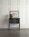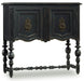 With a vintage charm, the black hand-painted leg chest with rub-though is nostalgic and timeless with turned legs and a stretcher, a shaped base and ring pulls on decorative back plates. Two doors with one adjustable shelf.