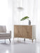 With a stylish Scandinavian modern flair, the Lisette Hall Chest combines a serene color palette of whites, creams and beiges with a cream-finished exterior, a patterned reed-like texture taupe-colored front and gold metal legs. Crafted of hardwood, the Lisette has 2 doors with soft-close hinges and one adjustable shelf behind the pair of doors.