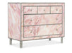 A tribute to the incredible strength and fortitude of those affected by breast cancer, the Eternal Chest features reverse painted class and watercolor-like pink hues complemented by silver accents, ribbed silver legs and silver-finished round metal knobs. The five self-closing drawers have pink interiors.