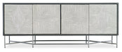 Cool, calm and chic, the Fine Lines Credenza is crafted of Mango Solids in a natural black wood finish with a brushed pewter metal base. On the door fronts is a black and white bone design in a diamond motif. The 4 doors have soft-close hinges and touch latches, and the interior finish matches the outside of the case. There’s one removable shelf behind each pair of doors. A ventilated back panel and wire management make the credenza media-friendly.