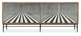 In a classic black and white color scheme with a casual modern twist, the Linear Perspective has a natural medium wood finish over Mango Solid Wood accented by black and white bone inlay on the door fronts and a black metal base. The 4 doors have soft-close hinges and touch latches and one removable shelf is behind each pair of doors. A ventilated back panel with wire management makes the credenza media-friendly.
