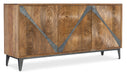 Organic and eclectic, the Vortex Credenza has a grooved swirl design on the door fronts in slate inlay, contrasting with the medium wood finish over Mango solid wood. The iron metal base adds more mixture of materials. The 3 doors have touch latches, with one removable shelf behind each door. The interior matches the outside of the case. Ventilated back panel and wire management included to make this piece media-friendly.