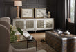 French romance meets modern glam with this TV-ready credenza, sure to be an admired focal point in your home. Crafted of Poplar and Hardwood Solids with Maple Veneers and Eglomise with Aluminum, Metal Buttons and Nails, the credenza has four doors with two shelves behind each set of doors, a ventilated back panel and accommodates up to an 80-inch TV.