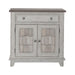Give your home a personal touch that reflects your passions and personality with the River Place accent cabinet. Crafted with Pine solids and veneers, this piece features a heavily distressed two-tone Riverstone White and Tobacco finish. Attention is immediately drawn to the two wood framed doors with a unique shingle accent design element with color tones of white, gray, and brown that blend effortlessly with the two-tone Riverstone White and Tobacco finish. One adjustable shelf is located behind the doors. There is one drawer with a wood framed drawer front. A high-low veneer pattern highlights the top and end panels and adds textural interest. The case is accented with custom Antique Pewter knob hardware. Wide Pilasters flow to angled block feet. The River Place accent cabinet strikes the perfect balance of life on the coast and a comfy home tucked away in the hills.