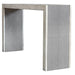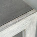 With modern elements, this transitional console features stitched panels of light gray faux shagreen, paired with a contrasting wood finish in a aged white with gray distressed details.