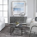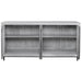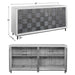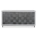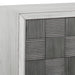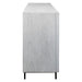 The perfect storage cabinet or the focal point of your room, this four door cabinet is constructed from mahogany wood in a whitewashed finish with light gray distressing. Each door features a reeded tile design in a striking pewter gray tone, with matte black metal legs. Both right and left sides open to reveal one adjustable shelf.