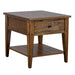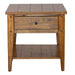 Enhance your space with the casual country style Lake House end table. Crafted of poplar solids and oak veneers, this piece features an oak finish, appealing planked top, one planked bottom shelf, one drawer for additional storage, simplistic wood and peg accents, antiqued brass knob hardware, anchored by a tapered leg design. The golden oak finish allows for a universal appeal.