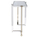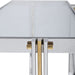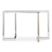 Modern glam console features an asymmetrical dual-toned stainless steel frame finished in polished nickel and polished gold with a clear tempered glass top.