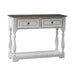 The Magnolia Manor hall console could be a graceful and versatile addition to your home décor collection. This exquisite piece seamlessly combines classic design elements with modern functionality, resulting in a statement piece that enhances any space with its timeless charm. Crafted with meticulous attention to detail using Rubberwood solids with White Oak and Birch veneers, this piece features an Antique White finish with a Weathered Bark finished top. The hall console features two drawers framed with delicate bead molding, each adorned with Antique Pewter knob hardware. These subtle yet elegant accents add a touch of vintage sophistication to the console's overall aesthetic. Elevating its allure are the chamfered pilasters and turned faceted legs, which lend a sense of refinement and grace to the console's silhouette. These architectural details create a visually captivating composition, showcasing the console's artisanal craftsmanship. Practicality meets style with the Magnolia Manor Hall Console, as it offers ample storage space and display options. The open bottom shelf provides the perfect spot for showcasing decorative items or storing everyday essentials, adding both functionality and visual interest to the piece. Whether placed in the entryway, hallway, or living room, this hall console makes a striking statement, effortlessly blending into any decor scheme while adding a touch of elegance and sophistication. Transform your space with the timeless beauty of the Magnolia Manor Hall Console, a testament to impeccable craftsmanship and enduring style.