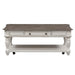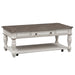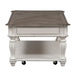 Accent your space with the perfect blend of European design with the Magnolia Manor rectangular cocktail table. Crafted of poplar solids with white oak and birch veneers, this piece features a weathered brown top with whitewash, one fully stained interior drawer with full extension drawer glides making access to storage a breeze, fancy face top, wood framed drawer fronts, bead molding, canted corners, faceted turned legs, casters that make rearranging effortless, and is accented by antique pewter knob hardware. Users can enjoy the added storage for items from magazines, to cozy throw blankets with the bottom shelf. Warm antique finishes and artistic distressing along with grand scale create a piece to be passed to generations.