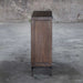 Soft contemporary styling, featuring a Paris silver finish, a subtle metallic silver over a light walnut stain, set atop a simplistic iron base finished in aged steel with coordinating door pulls. Has two adjustable shelves.