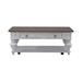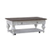 Create a calm and peaceful oasis with the River Place cocktail table. Crafted with Pine solids and veneers, this piece features a heavily distressed two-tone Riverstone White and Tobacco finish. There is one full extension drawer with a wood framed drawer front and bead molding accented by Antique Pewter knob hardware. The high-low veneer pattern of the top creates textural interest. Heavy, multi-turned legs flow to the open bottom shelf for additional storage or display items. Casters ensure easy mobility from place to place. The River Place cocktail table strikes the perfect balance of life on the coast and a comfy home tucked away in the hills.