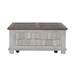 Create a calm and peaceful oasis with the River Place lift-top storage cocktail table. Crafted with Pine solids and veneers, this piece features a heavily distressed two-tone Riverstone White and Tobacco finish. Attention is immediately drawn to the side panels with a unique shingle design with color tones of white, gray, and brown that blend effortlessly with the Riverstone White and Tobacco finishes. The top features a high-low veneer pattern for textural interest. One side of the top offers a lift-top design allowing you to enjoy a snack while watching TV from the comfort of your couch while the other half of the top features a flip-top with tons of deep storage. Wide pilasters flow to the block foot base and casters for easy mobility. The River Place lift-top storage cocktail table strikes the perfect balance of life on the coast and a comfy home tucked away in the hills.
