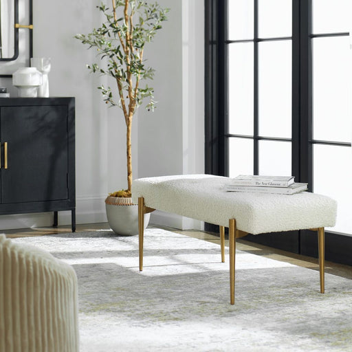 UttermostThoroughly modern yet inspired by the classics, this bench displays a stylish iron frame in a rich antique gold finish, upholstered in a crisp whit...