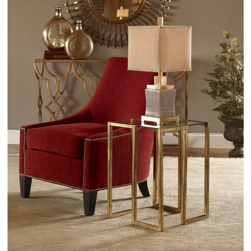 UttermostAn artful accent table featuring a contemporary forged iron design finished in antique gold leaf with a clear tempered glass top.Specifications Fe...