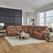 The Cameron 6 piece sectional is the ultimate relaxation companion. The Cameron sectional features triple power recline with a power articulating headrest and powered lumbar support in a Saddle colored leather. Stay connected and powered up with ease, thanks to the integrated USB-A and USB-C charging ports conveniently located within arm's reach. Additionally, the wireless charging pad in the console allows you to effortlessly charge compatible devices, eliminating the hassle of tangled cords. The console offers more than meets the eye, with deep interior storage for stashing essentials and hidden stainless steel cupholders that seamlessly appear with the push of a button. Whether you're enjoying a movie night or entertaining guests, this sectional ensures everything you need is within reach, while maintaining a sleek and clutter-free appearance. Indulge in personalized comfort with powered lumbar support and an added layer of memory foam in the seats, enveloping you in plush cushioning from head to toe. The T-cushion design provides extra space to lounge and stretch out, making this sectional the perfect spot for relaxation. And when it's time to return to an upright position, simply push a button to activate the return to home feature, effortlessly bringing you back to a comfortable seated position. With its blend of comfort, convenience, and innovative features, the Cameron 6 piece sectional is sure to become the centerpiece of your living space, where relaxation meets modern technology in style.