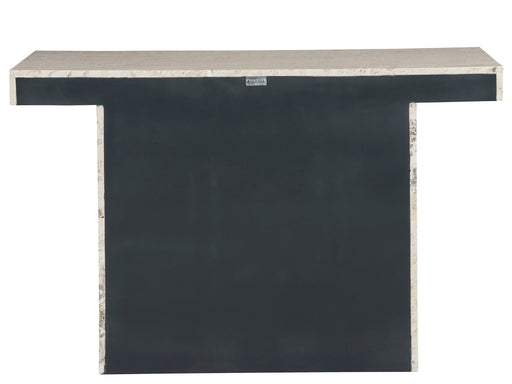 Universal FurnitureThe Quill Console Table presents a sleek, abstract expression in design, featuring a White Travertine top elegantly perched on a pedestal of Alumin...
