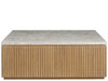 The Carmen Cocktail Table, a striking blend of natural beauty and modern design, features a sleek stone top and a distinctive base with a textured, indented design. Its smooth top provides a perfect surface for entertaining, while the casters allow for easy mobility, making it a versatile piece for any room.
