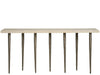The Lowry Console is a striking piece of modern design that celebrates the interplay of positive and negative space. Its slender, nickel-finished metal legs create an airy, almost ethereal quality, while the solid white travertine top provides a grounding element. This bold combination of materials and minimalist design makes the Lowry Console a captivating focal point for any hallway or entryway.