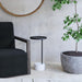 This metro modern styled chairside table is the perfect accent for the home. Features a solid marble base with a cantilevered bronze top.