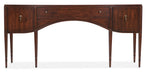 Honor the majestic beauty of the Federal and Georgian design period with the heirloom-quality Charleston Console Table. Featuring thin tapered legs, a curved case front and walnut inlay border on the top and door and drawer fronts, the table has two doors with soft-close hinges and one center drawer with self-close drawer guides. Crafted of Cherry Veneers and Walnut Inlay, it is finished in Maraschino Cherry using natural grain Cherry Veneers showcasing dramatic cathedral patterns in the wood. The pendant and round pulls are finished in an antique bronze color.