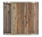 In a dynamic blend of shape and materials, the Open Ended Table combines a pewter metal frame with a planked-wood motif in a natural medium wood finish with distressing and visible knots. The curved design has one fixed shelf.
