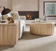 This round cocktail table features a scalloped silhouette, light oak finish, and hidden casters for flexible living room styling.