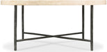 This round cocktail table pairs a textured metal base with an X-stretcher and a stone top for a look that’s both industrial and elegant. The stone surface adds natural variation and durability, making it a centerpiece that’s as functional as it is striking.