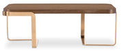 The Eleana Cocktail Table brings understated elegance to any living room with its Light Caramel walnut veneer finish and plated Sunlit Bronze bent-metal base. Its softly rounded rectangular shape offers a modern look while providing ample surface space for serving or displaying decorative pieces.