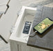 Details Made of pine wood, pine veneer and engineered wood, Two-tone finish; distressed weathered gray top with distressed vintage white base, Antiqued iron-tone hardware, Cabinet door reveals single fixed shelf, 110V power supply with dual USB charging port, Power cord included; UL Listed, Minor assembly required, simply lay flat and attach feet