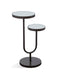 The High-Low Scatter Table boasts modern contemporary styling. The table features two staggered, mirror table tops that are perfect for holding drinks and snacks. The dark bronze metal stand features curved tubed support on a large circular base.