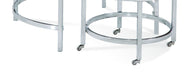 The Jadyn round cocktail features a cocktail with a clear glass top and a nesting table with a solid stone top and piano casters.