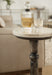 A perfect perch for refreshment at the end of a tiring day, the Rabbs Prairie Martini Table contrasts a shaped base finished in a dark Flemish paint with a stone top for an eclectic look. Offered in a convenient compact footprint, only 14 inches wide.