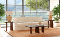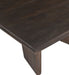 The Lasso Rectangular Cocktail Table features a modern organic inspired design. The thick, soft-edged table top sits on a unique, offset tapered base design. This cocktail table is constructed with solid mango wood that's been sandblasted for texture with a deep, antiqued brown stain that highlights the features of the natural wood. Look for other items in the Lasso Collection to complete the set.