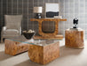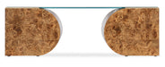 Earthy and intriguing, the Burlesque Coffee Table is crafted of Mappa Burl Veneers in a tile pattern in two half-oval sections connected with a clear tempered glass top and gold trim on the top complementing the warm golden finish of the piece.