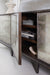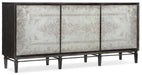 Dark and handsome meets shimmery and romantic with the alluring Rosella Console. Hand-painted eglomise glass with a silver leaf pattern on the door fronts is accentuated by an oak veneer case and legs in a rich dark finish. Three doors with soft-close hinges with 2 drawers behind the left door and 2 shelves behind the right pair of doors. Ventilated back panel in the right section to make this piece electronics-ready.