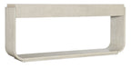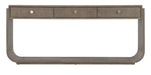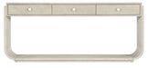 Symmetrical and timeless with a luxe mixture of materials, the soft and sophisticated Modern Mood Console Table has a narrow rectangle shape with rounded sides and a raffia-wrapped drawer front and top. Crafted of Quartered Oak Veneers with wire-brush detailing, it is finished in the serene Diamond finish, accented by round knobs in a warm pewter finish wrapped in leather.