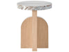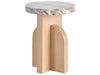 The Riverine Accent Table displays a stunning combination of a smooth marble top and an angled, oak-finished pedestal base, creating the perfect punctuation to a favorite chair or sofa.