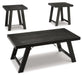 Details Includes coffee table and 2 end tables, Made of Acacia veneers, wood and engineered wood, Distressed black wash finish, Canted legs with stretchers, Tops have a bread board layup with a planked effect, Coffee table with tension bars, Assembly required