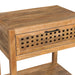 The Pentak End Table features a beautiful natural mango wood finish that brings in varying brown tones. The single drawer is accented with open pierced fretwork detailing. The matte black iron bar drawer pull gives this boho style some industrial flair. Also includes lower shelf for some additional storage space.