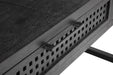 - Features square fretwork on the drawer fronts and large metal bar pulls for an industrial flair