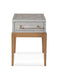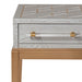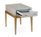 The Perrine Chairside Table will make the perfect addition for your home. The gold legs pop against the soft graphite gray table top. The top is accented with antique gold geometric inlay design, and custom acrylic hardware for the draw pulls.