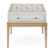The Perrine White Chairside Table showcases versatile transitional styling. With a soft white finish on flat cut oak veneers, it brings a sense of elegance to your space. Its top features a satin brass geometric design, echoed by the satin brass base and acrylic bar pulls with satin brass accents on the single drawer. The combination of finishes and materials adds charm and character to this trustworthy piece of furniture. It's a delightful addition to your home, marrying style and function seamlessly.