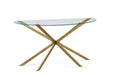 The Tess Console Table is a sophisticated piece that brings a modern flair to any entryway or living space. Its striking starburst base, finished in a luxurious gold tone, beautifully supports the sleek, semi-oval tempered glass top, offering both style and functionality. Perfect for displaying decor or serving as an elegant accent, this console table seamlessly blends with contemporary interiors while standing out as a statement piece.