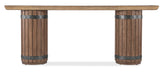 Capture the essence of the Napa Valley lifestyle with the Vineyard Row Console Table. Measuring 86 inches wide by 20 inches deep, the table has rustic wine barrel-influenced pedestal bases and hammered metal accents. Crafted of Pecky Hickory Veneers with resin, the top is finished in the light and airy Sonoma tone, and the base is in Napa, a darker tone inspired by the red wines of the Napa Valley