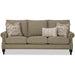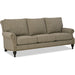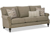 Classic traditional details and nail head trim accents are the things you'll notice first on this gracefully finessed sofa. It features a rollover back, cut-back rolled arms, and beautifully turned legs that offer a familiar heirloom touch. Attached box border back pillows. Optional nail finishes available. Also available is the matching loveseat, chair 1/2, and ottoman. Also available without nail head trim.