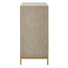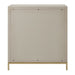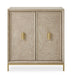 This refined two-door cabinet showcases the natural beauty of oak with a subtle cerused finish, highlighting the wood's grain. The clean lines are complemented by brass plated iron pulls and matching legs, adding a contemporary touch to its classic design.