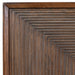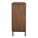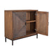 Crafted from mindi wood in a warm finish, the Bottom Line Two-Door Cabinet features carved detailing that accentuates the natural wood grain and design, beautifully contrasted by sleek bronze metal legs and door pulls.