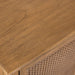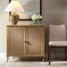 Mid century inspired with accents of natural rattan cane, this two door cabinet features mindi solids and veneers finished in a soft oak stain. The two doors have metal hardware finished in dark gunmetal.