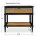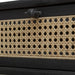 This side table, crafted from Mindi wood in a sleek black finish, showcases natural rattan cane webbing on the drawer front and lower shelf. It is beautifully accented with matte black hardware, adding a touch of contemporary elegance to its design.